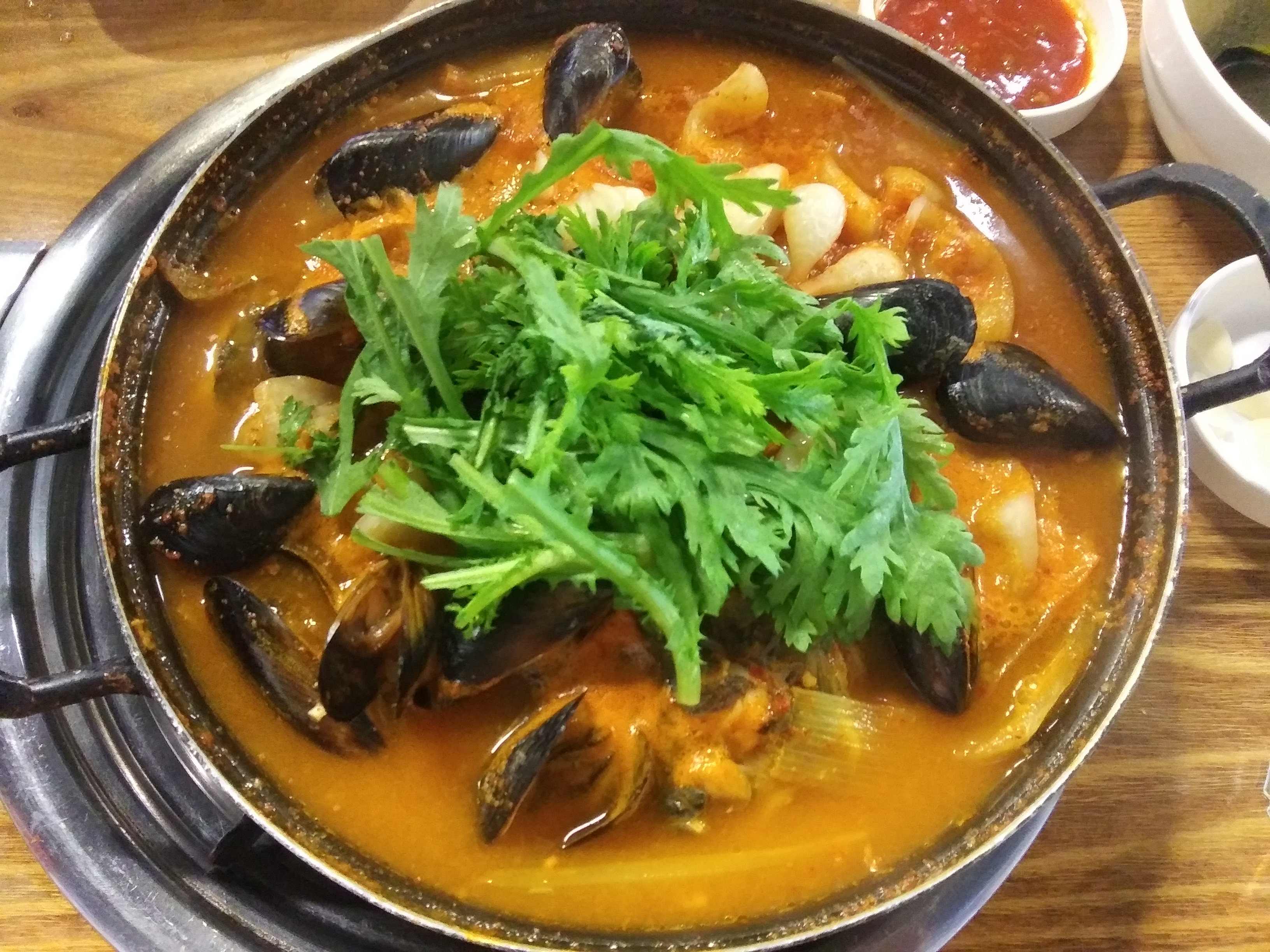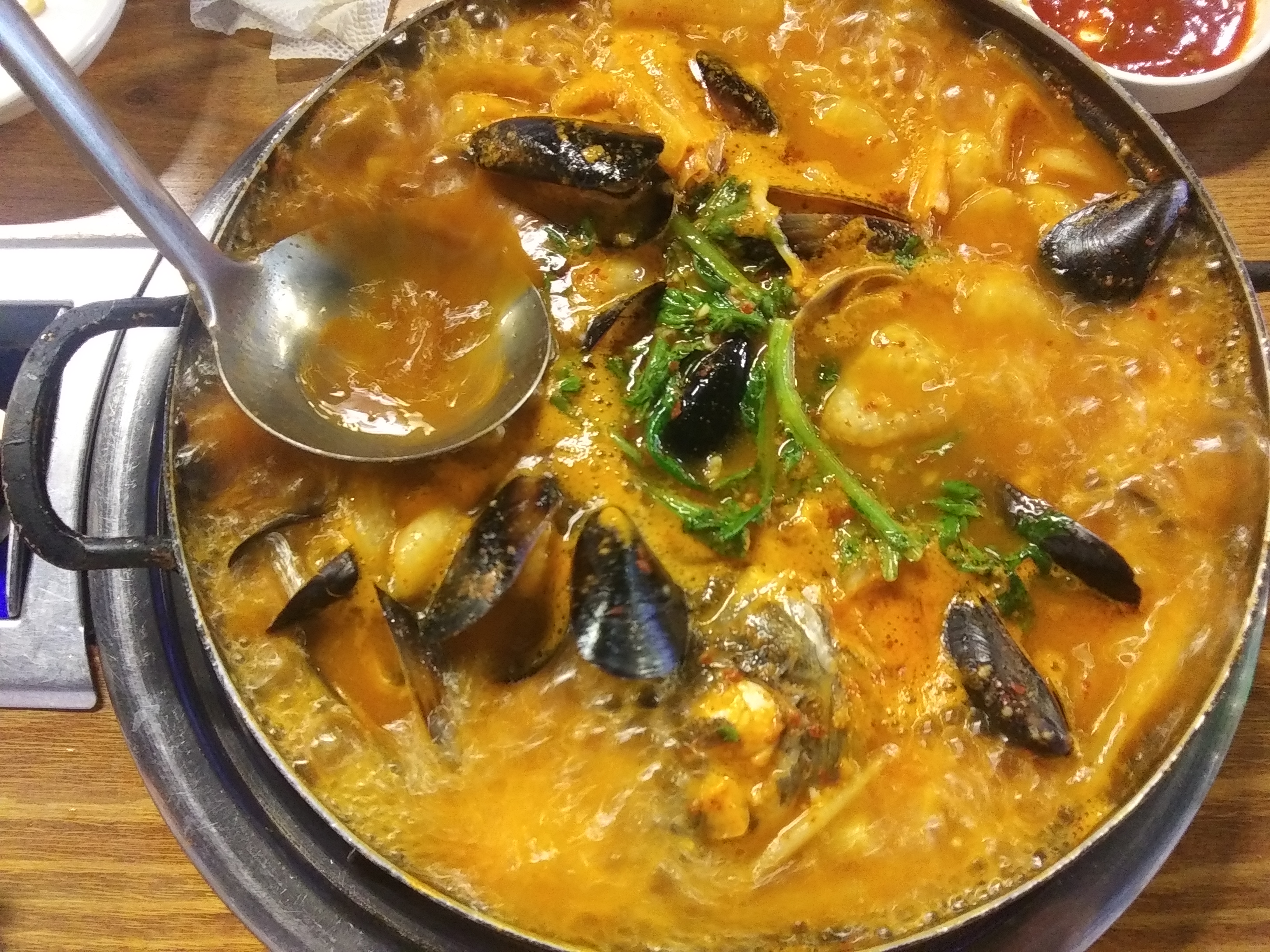 6천원 짜리 매운탕에 천원 짜리 수제비를 추가했습니다. 홍합과 조개가 들어있고, 내 사랑 쑥갓도 들어있네요.