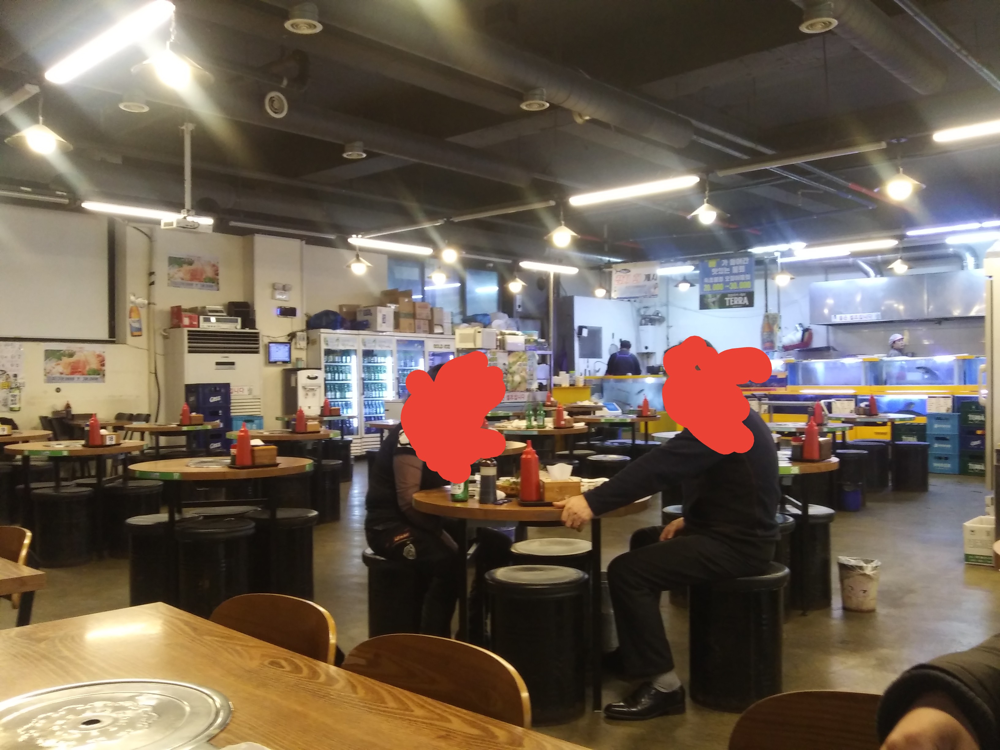 내부가 꽤 넓습니다. 사진을 한쪽만 찍어서 좁게 보이는데 꽤 널찍한 횟집입니다. 벽쪽 자리는 등을 기댈 수 있는 좌석이며 네모난 테이블입니다. 반면에, 홀 중앙에는 둥근 테이블이 놓여 있습니다. 선호하는 자리에 앉으면 되겠죠?